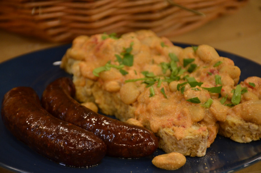 Ispecite kobasice na gril-tiganju. Na tiganju na maslinovom ulju propržite luk, dodajte pasulj pa ostale sastojke. Dinstajte sve sastojke nekoliko minuta, servirajte sa kobasicom, prelijte sokom od limete i pospite peršunom.