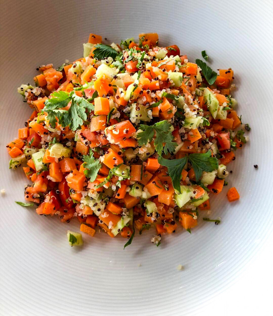 Jednostavno se pravi, za nekoliko minuta. Potrebni su vam jedan krastavac, paradajz, paprika i peršun koje ćete iseckati i posuti kinoom. To je ceo proces, a dobićete savršenu salatu koja osvežava i vraća energiju dok ste rekli „najbolji teniser planete“!