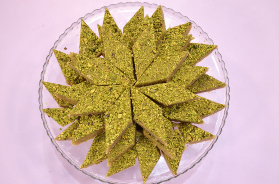 U suvom dubokom tiganju pet minuta na srednjoj vatri pržite obe vrste brašna sa kardamonom. Zatim dodajte mlaku slatku pavlaku, promešajte i sipajte ulje i puter. Sve mešajte pet do sedam minuta da dobijete testo lepljive teksture. Sklonite sa vatre. U vodu uspite šafran i ostavite pet minuta. Stavite u šerpu vodu sa šafranom, dodajte šećer i kuvajte da se šećer otopi. Dobijeni sirup sipajte u testo i vratite ga još malo na vatru da se smesa ujednači. Razlijte je u posudu, pospite pistaćima i ostavite da se stegne, alvu isecite u romboide.