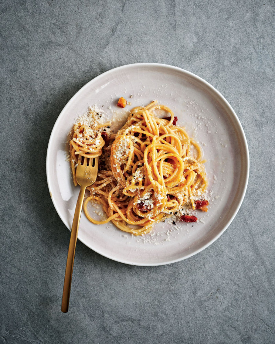Recept Gvinet Paltrou krije jedan trik ‒ kada umutite jaja i parmezan, smesa će podsećati na kajganu, i to je odlično. Ne zaboravite da sačuvate šoljicu vruće vode u kojoj su se kuvali špageti, napomena je slavne glumice, jer je upravo taj dodatak najvažniji za postizanje svilenkaste teksture umaka.