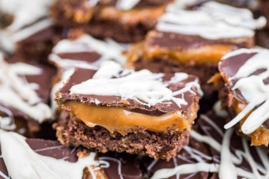 Drugi sloj pripremite tako što ćete u šerpu staviti 200 grama putera, 200 grama šećera, tri kašike karamel-sirupa i 400 grama mleka u prahu. Mešajte na laganoj vatri da se puter otopi. Povećajte temperaturu, sačekajte da proključa, a zatim, uz stalno mešanje, kuvajte još nekoliko minuta, da se zgusne.
