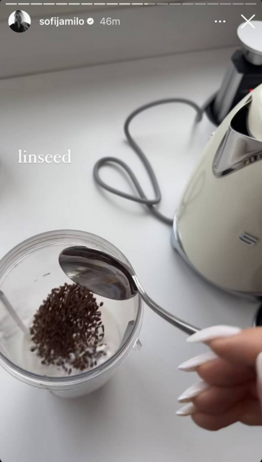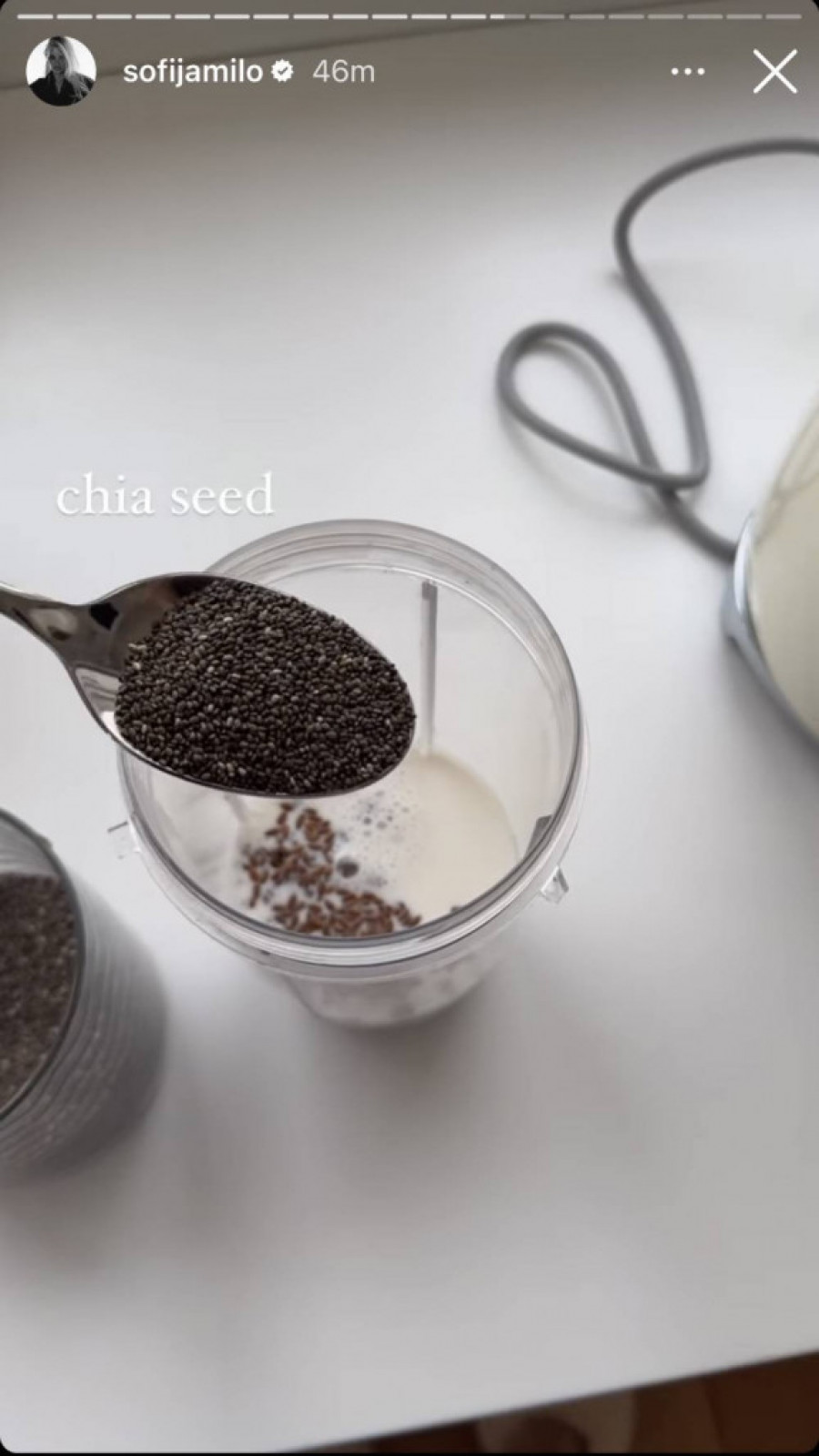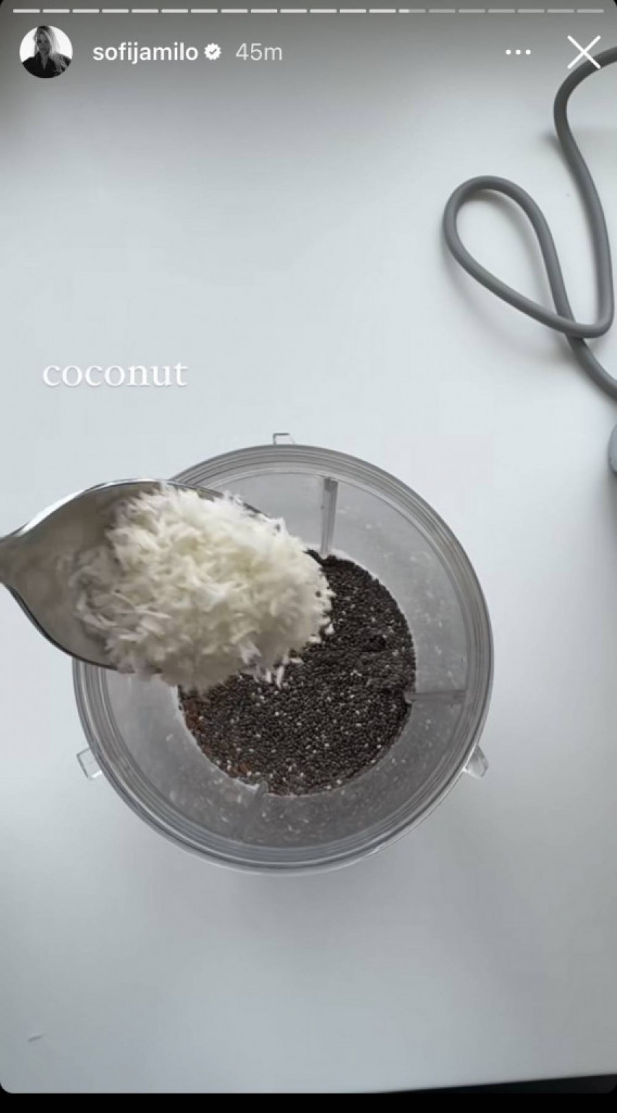 Sofija kao bazu za svoj smuti koristi bademovo mleko sa aromom kokosa i u njega dodaje po kašiku čia, kao i lanenih semenki.