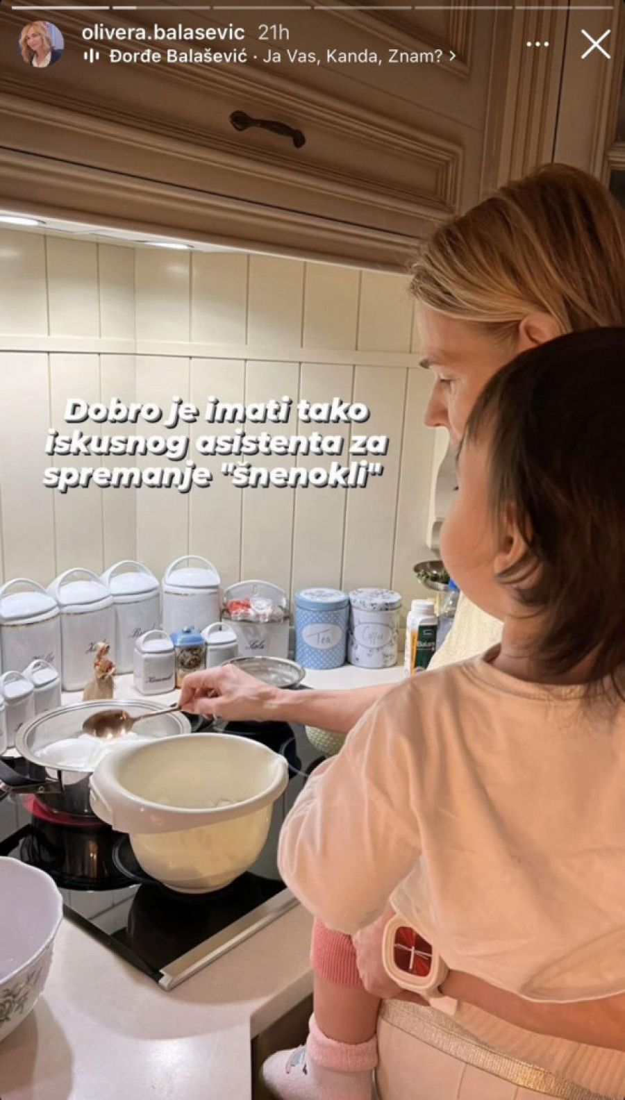 Društvo joj je pravio najslađi pomoćnik, unuka Vera. „Dobro je imati tako iskusnog asistenta za spremanje šnenokli“, napisala je Olja u Insta storiju. Sigurni smo da su svi ukućani uživali u „snežnom“ desertu.
