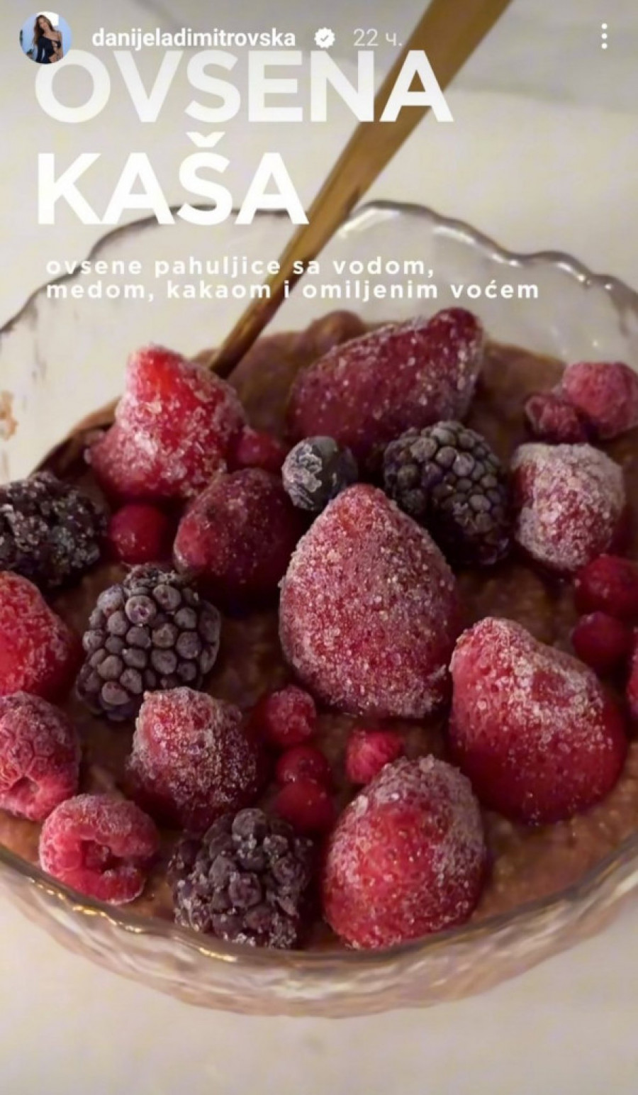 Danijelin doručak sastoji se od ovsenih pahuljica pomešanih sa vodom, medom, kakaom i omiljenim voćem. Ona se opredelila za bobičasto voće: jagode, maline, kupine...