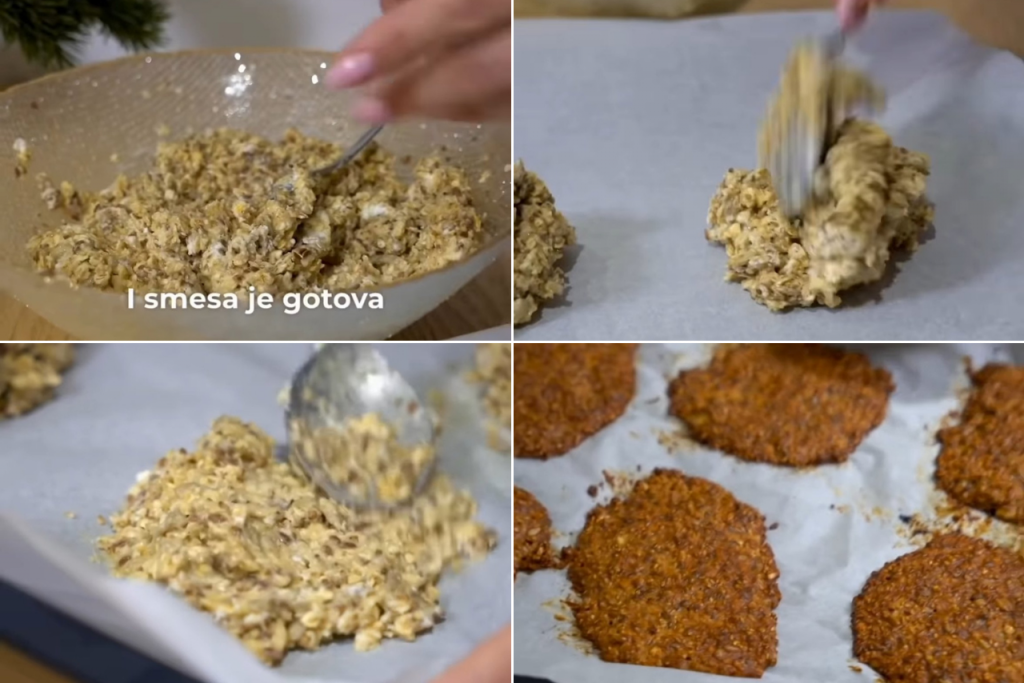 U jednoj posudi pomešajte suncokret, susam i laneno seme. U drugoj posudi pripremite ovsene pahuljice. U trećoj posudi sjedinite nemasni sir, dva jaja, kašiku maslinovog ulja, malo soli i prašak za pecivo. Sve sastojke sjedinite i dobro promešajte dok ne dobijete ujednačenu smesu. Kašikom vadite smesu i oblikujte male pogačice na plehu obloženom papirom za pečenje. Pecite u prethodno zagrejanoj rerni na 150 stepeni C oko 45 minuta, dok peciva ne dobiju zlatno-smeđu boju.