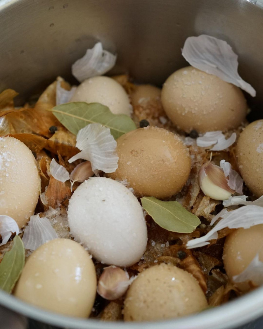 Lukovina se ređa prvo na dnu lonca jedan sloj, pa se poređaju jaja, pa opet lukovina. Proces ponoviti, a na vrh staviti sloj lukovine. Ulje, sirće i začini dodaju se posle svakog sloja.