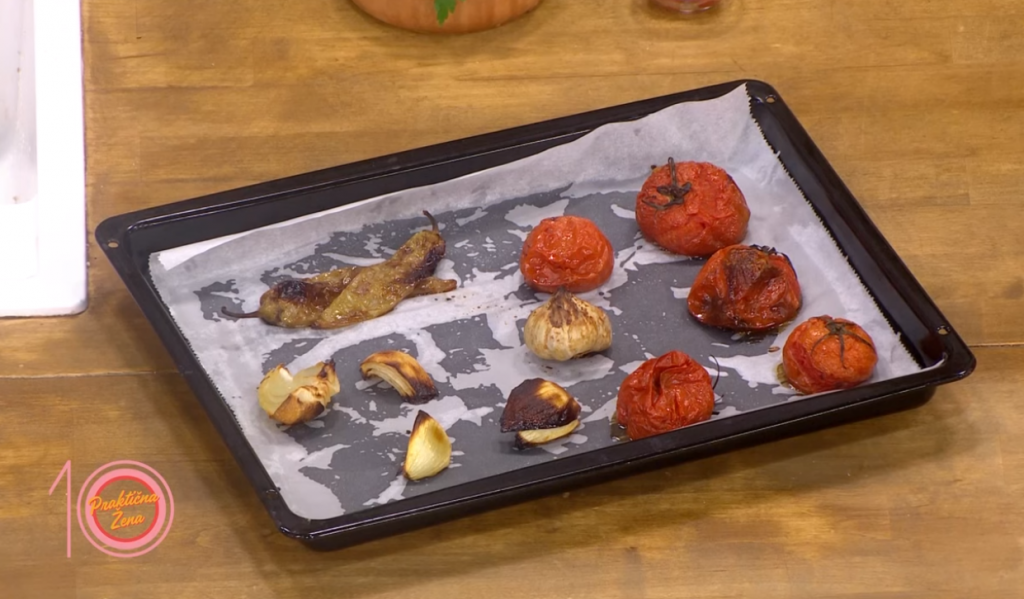 Za crveni sos ispecite povrće (paradajz, papriku crni i beli luk) u rerni oko 20 minuta na 180°C. Kada se povrće ispeklo i malo prohladilo, ubacite ga u blender s tim da beli luk pritisnete da iscuri sredina. Sve lepo izmiksajte pa dodati začine, korijander i paradajz pastu i sve opet izmiksajte da dobijete namaz.