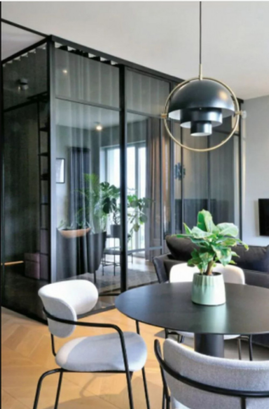Zahvaljujući ovom potezu, moderan nameštaj i staklena pregrada izbili su u prvi plan. Paradoksalno, ovaj enterijer ne ostavlja utisak mračnog iako se stiče utisak da je prepun crnih elemenata. Naprotiv, čitav prostor deluje vrlo razigrano i dinamično jer su na kraju svetle boje ipak nadvladale crnu.