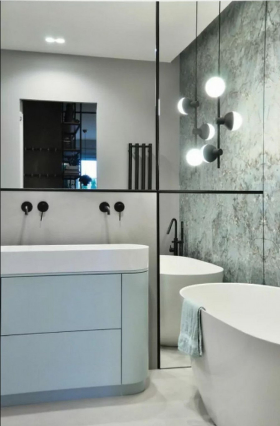 Tu se našla upečatljiva visilica kao jedini dekorativni element, ali zbog svojih crnih mat linija savršeno se uklopila sa baterijama. Pored tuš-kabine, bilo je dovoljno mesta za samostojeću kadu što nam ukazuje na priličnu udobnost ovog kupatila.