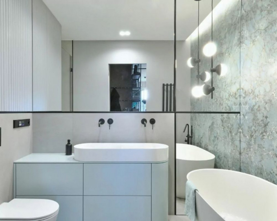 Kupatilo ne odstupa od principa dizajniranja koji je zastupljen u stanu, osim što dominiraju svetle površine. Donekle je bio cilj formirati čist i sterilan ambijent koji je oplemenjen jednim zidom obloženim interesantnim mermernim pločicama u svetloplavoj nijansi sa podtonom zelene. Kako bi se prostorija vizuelno proširila, ali i postigla elegancija, veliki deo zida uz koji je postavljen lavabo, obložen je ogledalom.