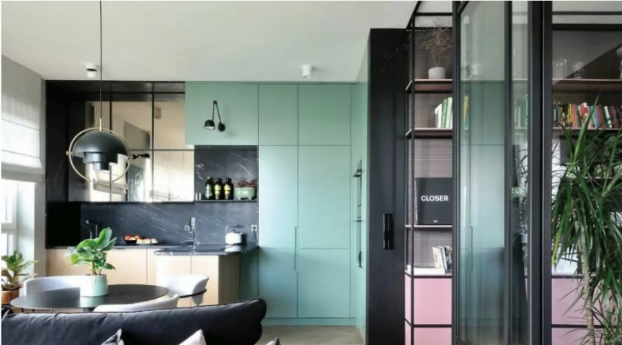 Dinamični kolorit najviše dolazi do izražaja u kuhinji koja je veoma neobično osmišljena. Donji elementi i šank su sačinjeni od drveta, dok su radna površina i zid obloženi kompozitnim materijalom s izgledom crnog mermera. Ono što je čini interesantnom jeste ogledalo koje je postavljeno na frontove zidnih elemenata stvarajući upečatljivu refleksiju u prostoriji. A svakako je najdominantnija mint zelena nijansa kojom su obojeni svi ostali elementi. Saksijsko bilje koje je postavljeno u dnevnoj zoni čini prostor vrlo prijatnim za boravak, a ne manjka ni detalja koji osim vrlo elegantnog i jednostavnog nameštaja dopunjuju prostor.