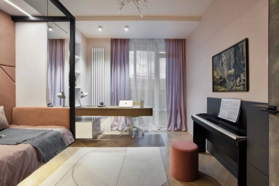 Odmah do njega je polica sa više otvorenih segmenata, na koju se naslanja konzolni radni sto u dekoru drveta. U ovoj neobično dizajniranoj sobi našlo se još mesta za klavir.
