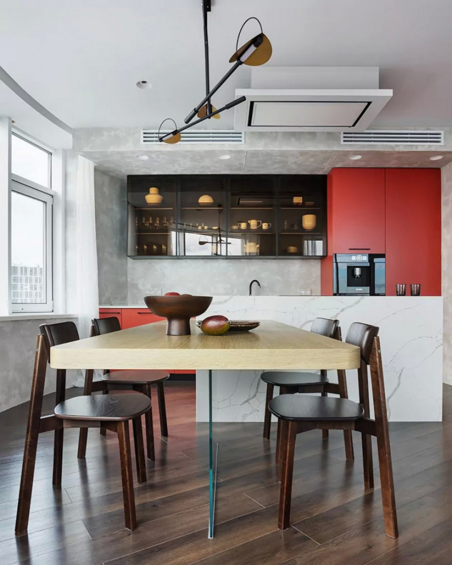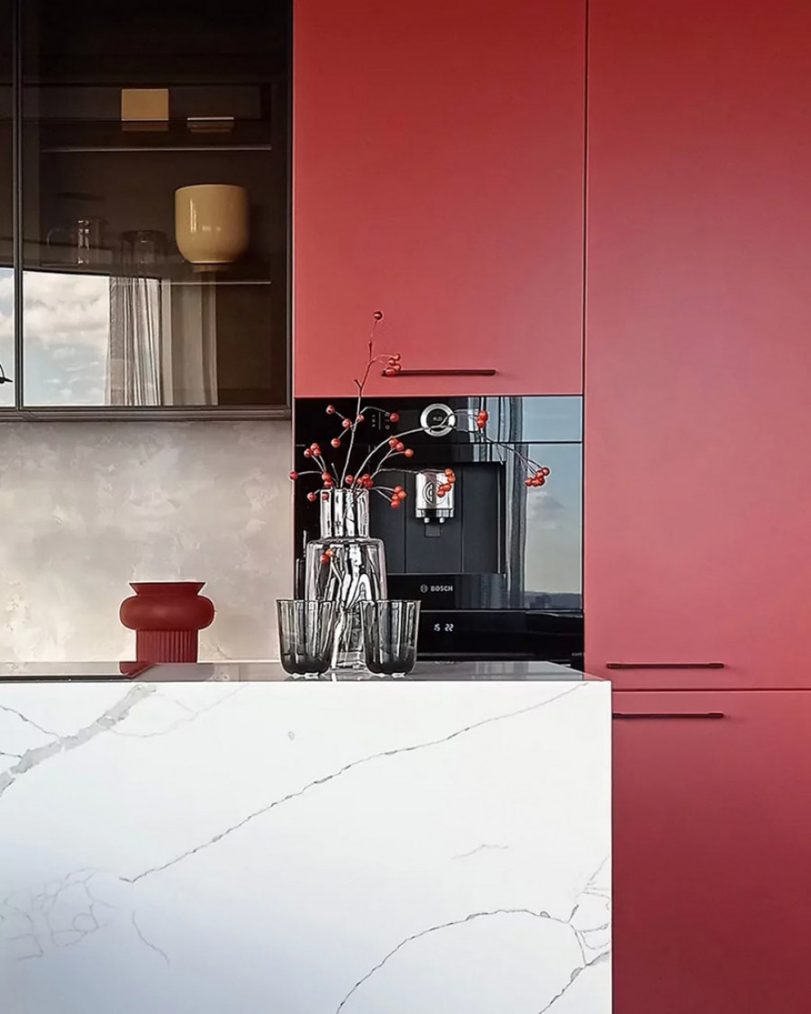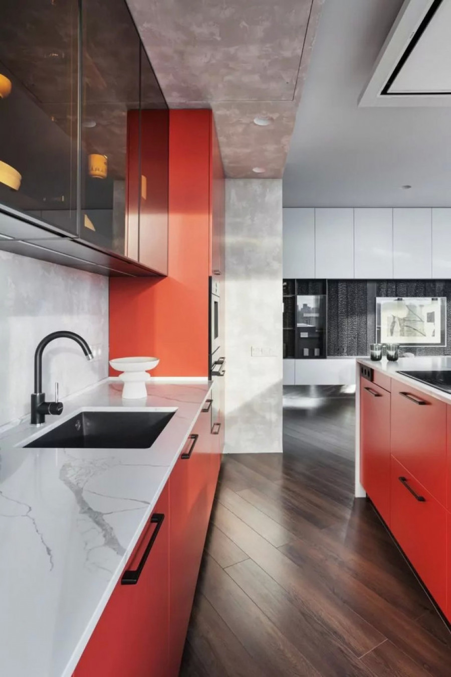 Kuhinja je postala srž stana. Centralni element u ovoj prostoriji je kuhinjsko ostrvo „uvijeno“ u pločasti materijal koji oponaša izgled mermera, dok je deo okrenut prema kuhinji, kao i većina kuhinjskih elemenata izrađena od medijapana crvene boje.