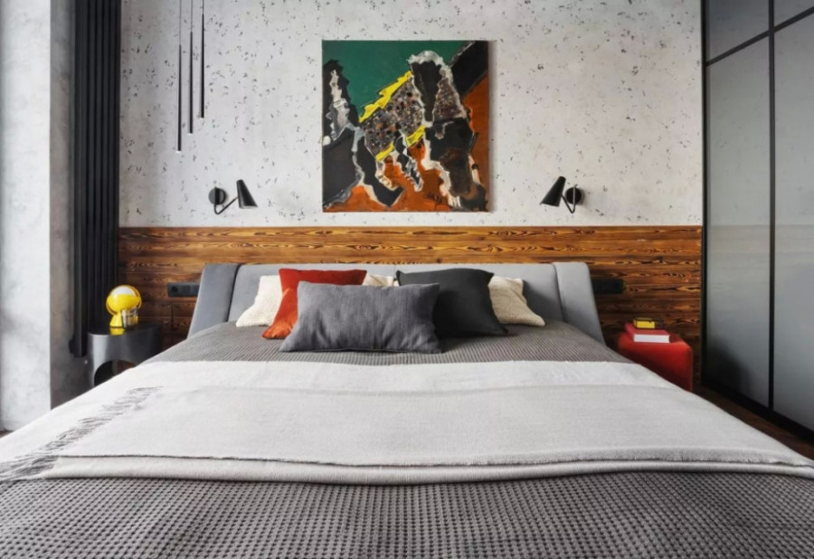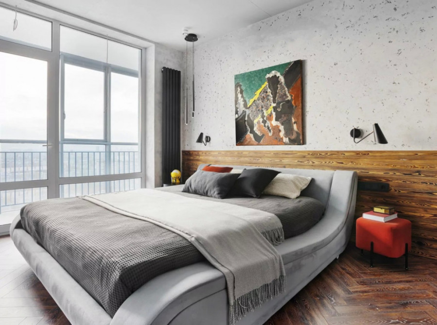 Roditeljska spavaća soba opremljena je vrlo jednostavno, ali atraktivnost nije zabišla ni ovaj deo stana. I ovde se arhitekta odlučio za neobičnu obradu zidova na gornjoj polovini, koja je na savršen način istakla lepotu drveta kojom je obložena donja polovina.