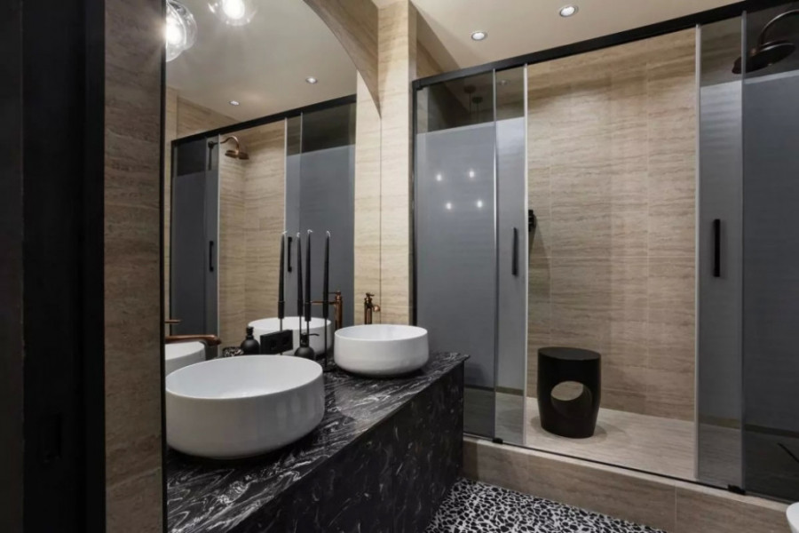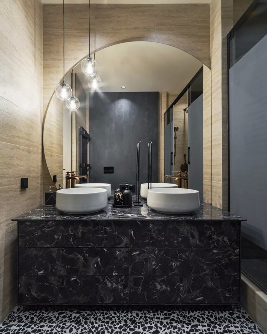 Na ormariću rađenom po meri, s pločom sa izgledom mermera u crnoj boji, postavljena su dva okruga umivaonika. Zbog tamnijeg kolorita, osim ugradne rasvete, bilo je potrebe i za dodatnim lampama blizu velikog okruglog ogledala.