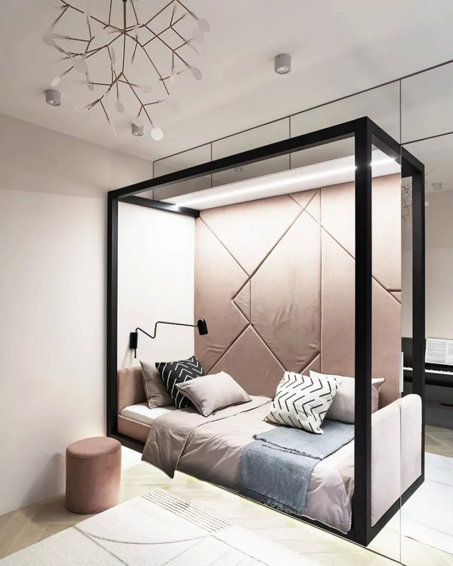 Interesantan momenat u sobi osmogodišnje devojčice svakako je zid obložen ogledalom na koji je fiksirana drvena konstrukcija odignuta od poda u okviru koje se krevet.
