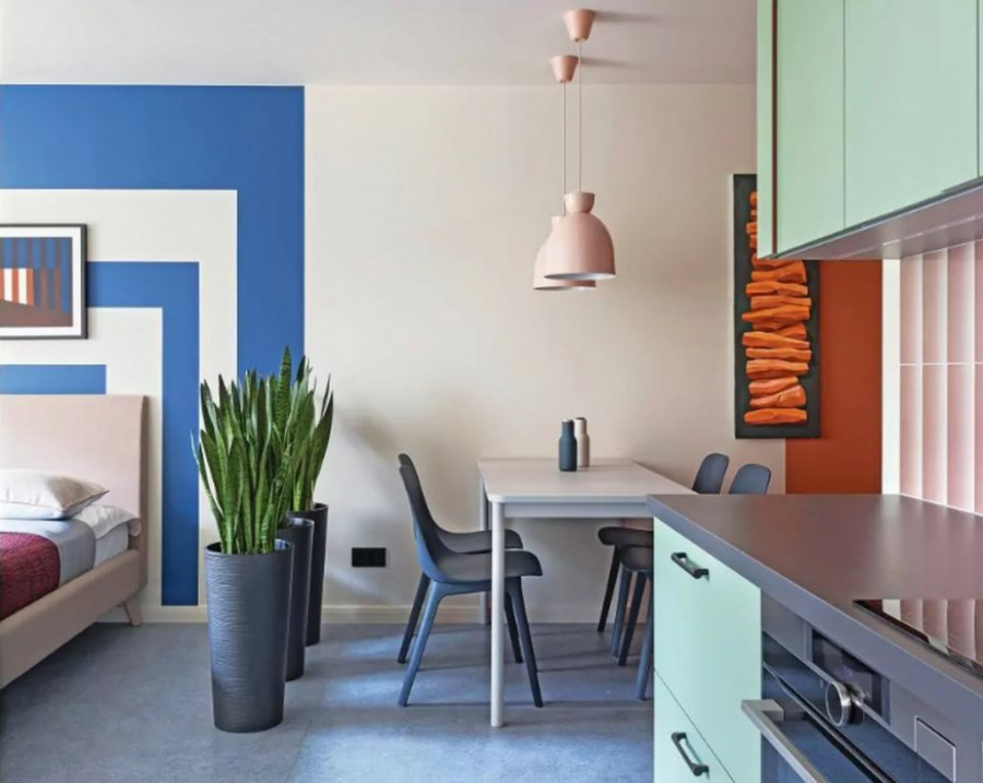 Ono što možemo primetiti na prvi pogled jeste da je trend Color Block, osim što je uveliko osvojio modne piste, našao i u ovom enterijerskom prostoru. Stan, osim što je male kvadrature, ima vrlo nizak plafon, koji je u vizuelnom smislu povećan tako što je obojen belom bojom.