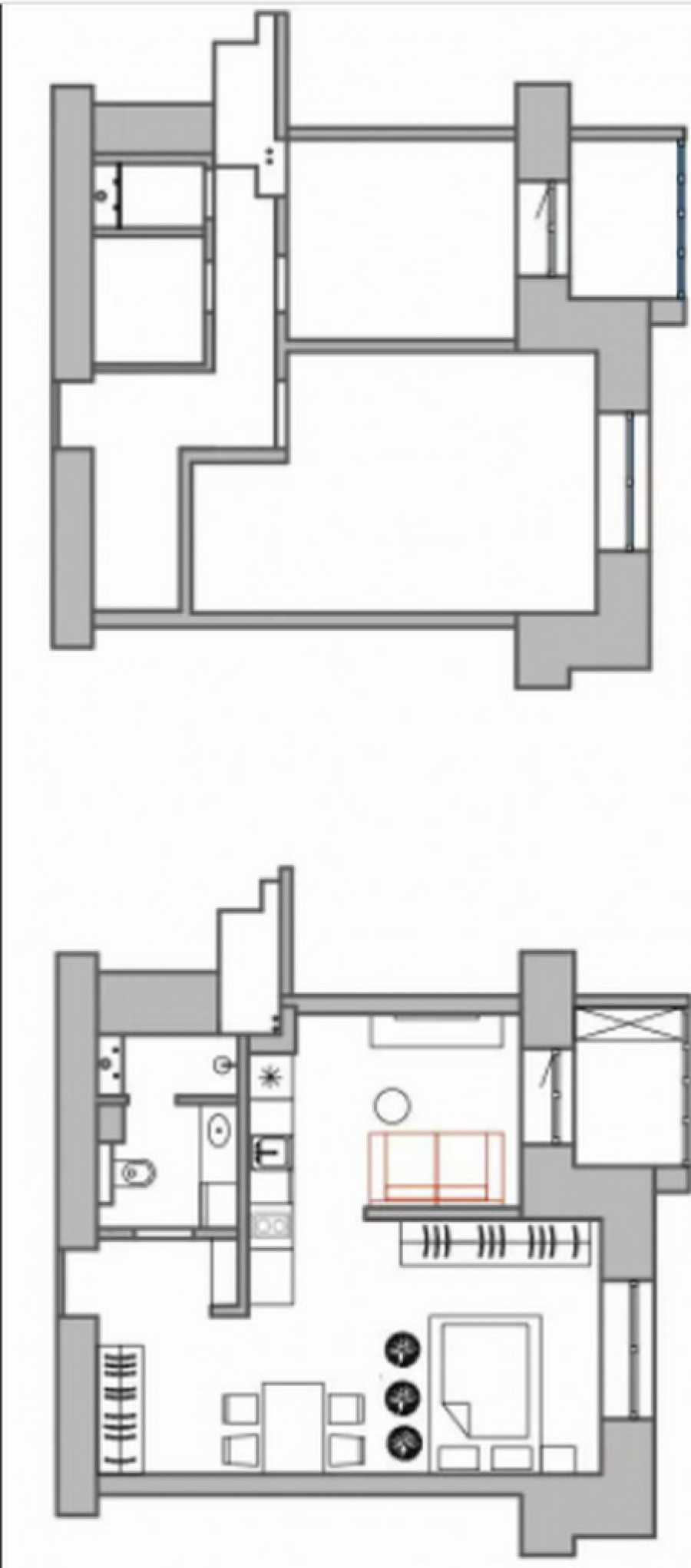 Prvobitno je to bio klasičan jednosoban stan, ali kako bi svaki kvadratni metar bio dobro iskorišten, moralo je doći do drastičnih promena kao što su uklanjanje nepotrebno uskog i dugačkog hodnika, spajanje kupatila i rušenje dela zida kako bi se formirao otvoren plan. Pored ovih intervencija, važna stavka je bila formiranje dovoljno ormara za odlaganje, kao i normalnog prostora za spavanje. Kako bi se različite funkcije ipak naglasile u ovom otvorenom prostoru korišćene su jarke boje.
