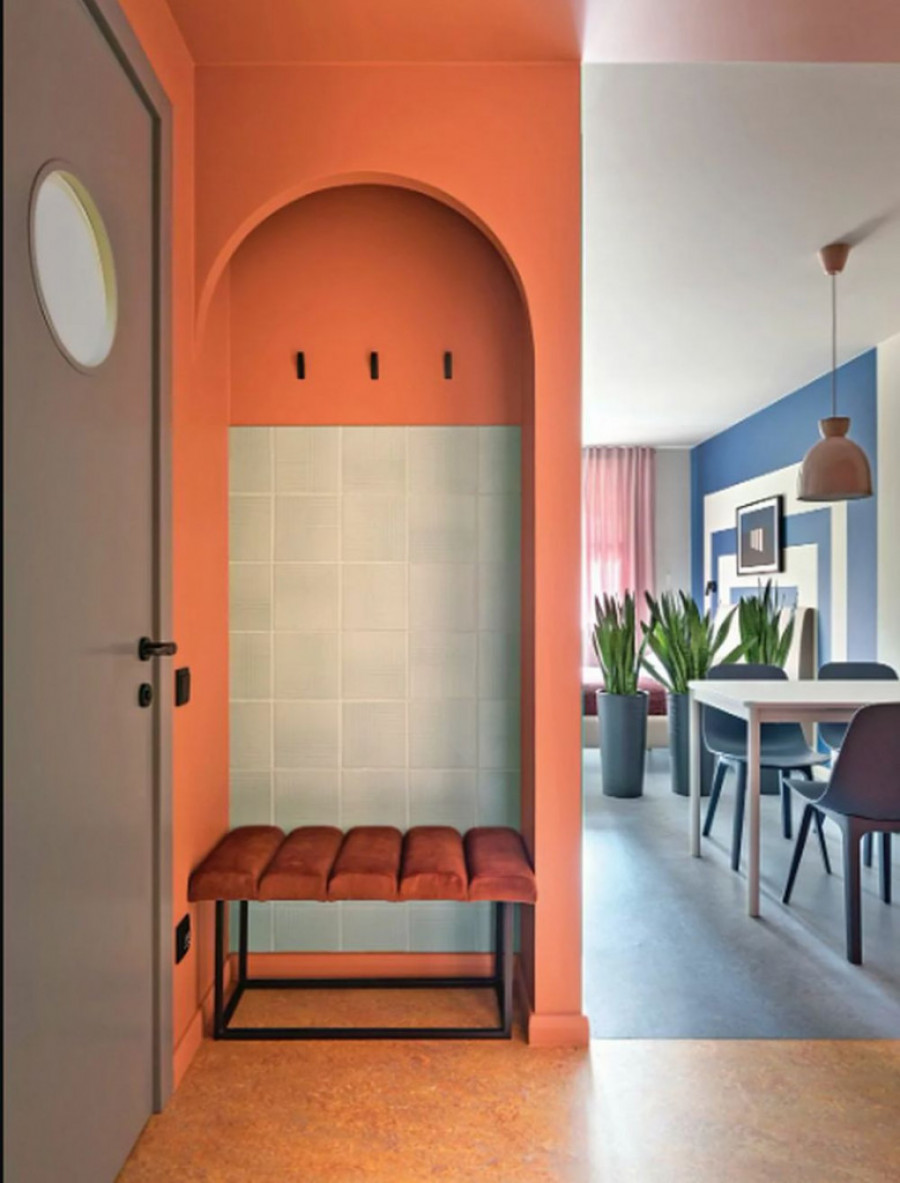 Tako na ulazu prvi utisak ostavlja koralno narandžasta koja se prenela jednim delom i na plafon, a na podu su postavljene pločice kako bi ograničile ulazni hol od ostatka stana. Svakako je najzanimljiviji detalj niša u obliku arkade sa klupom za sedenje, a uz zid je postavljen sistem ormarića do plafona koji pomažu u optimizaciji prostora za odlaganje u malim stanovima.