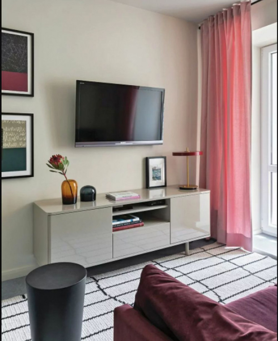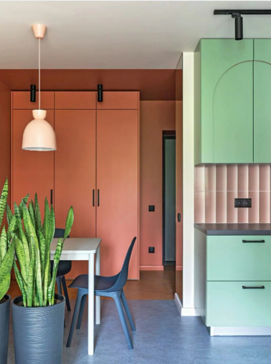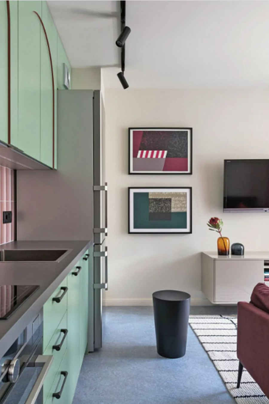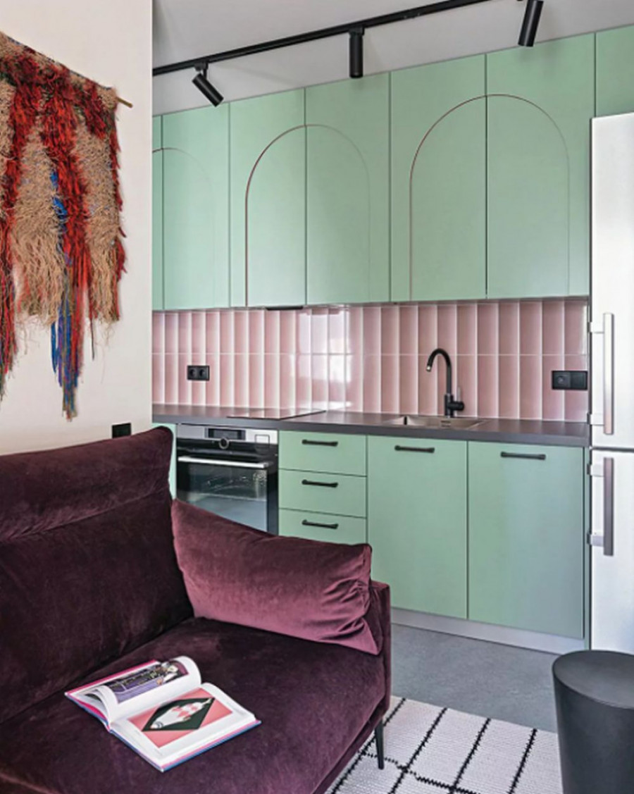 Za kuhinjske elemente odabrana je zelena boja u nijansi mente, a zidovi dnevne sobe su ofarbani belom kako bi svetlo i detalji došli do izražaja. Smeštena je pored izlaza na balkon tako da velika staklena vrata dopuštaju ulazak velike količine prirodne svetlosti, a da obezbedi privatnost postavljena je ženstvena ružičasta zavesa.