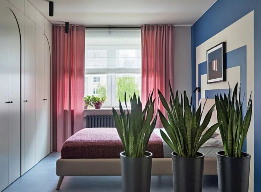 Prostor spavaće sobe je označen plavim simetričnim geometrijskim uzorkom iza uzglavlja, dok se ormar nasuprot kreveta stapa sa nijansom zidova, čineći ga skoro nevidljivim. Ormari takođe zauzimaju celu visinu, a glavna vrata su zasvođeno oblikovana.