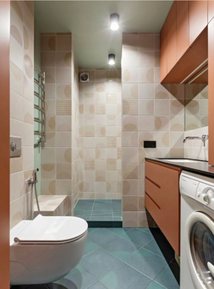 Vrata pepeljasto sive boje vode u kupatilo popločano nijansiranim pločicama narandžastog kolorita. Nakon spajanja je dobilo dovoljno prostora za formiranje velike tuš kabine i mnogo ormarića za odlaganje. Ugradni lavabo i jednostavno ogledalo doprinose eleganciji, a smena tirkizne i plave boje na podnim pločicama se odlično uklopila u ambijent.