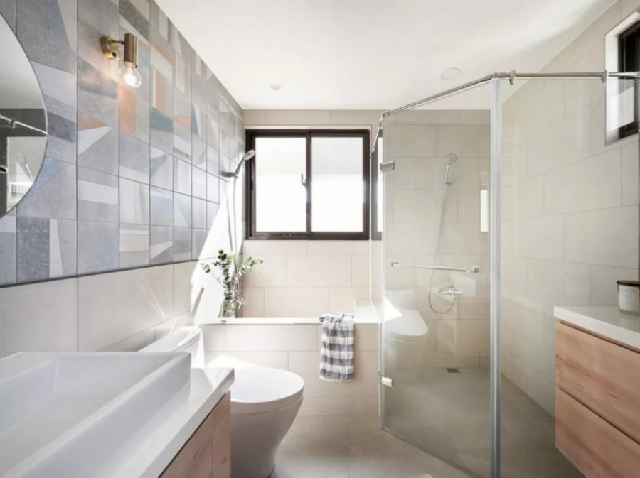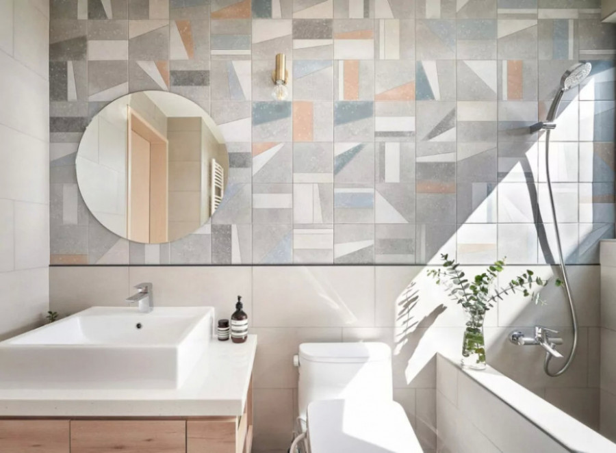 Kupatilo je prilično kompaktno i dobro organizovano. Tuš-kabina, sa staklenim paravanom u metalnom okviru, pozicionirana je u uglu, a odmah pored nje ozidana je kada manjih dimenzija. Ovde se nalaze i dve komode – jedna služi za odlaganje raznih sitnica, dok je na drugu postavljen polu-ugradni umivaonik. Ceo ambijent su zanimljivim učinile pločice koje su već upotrebljene i u kuhinji.
