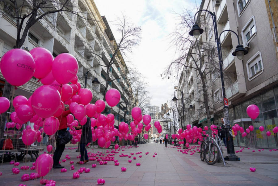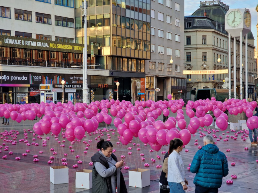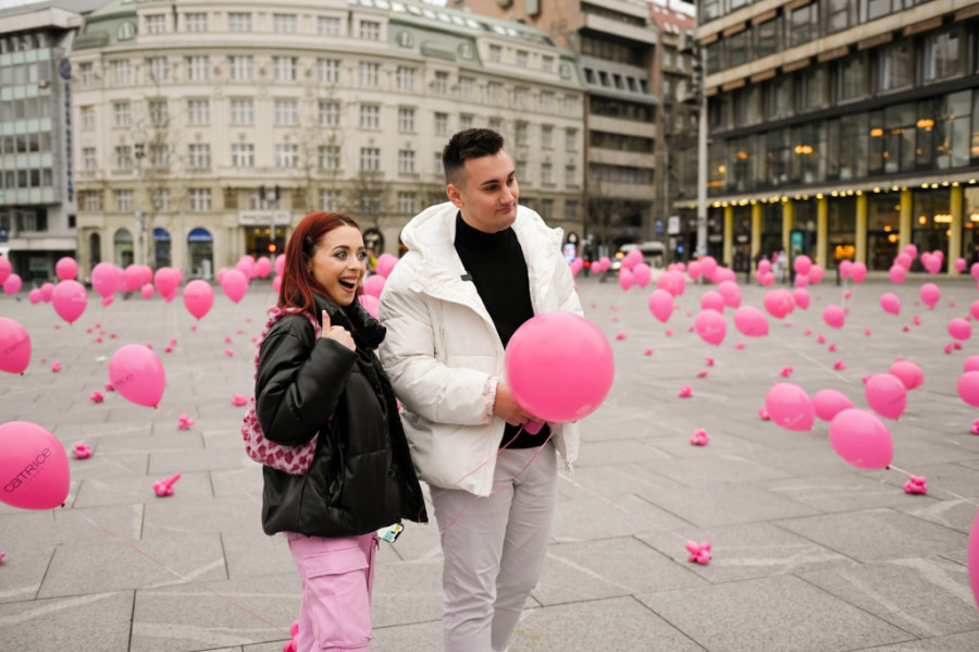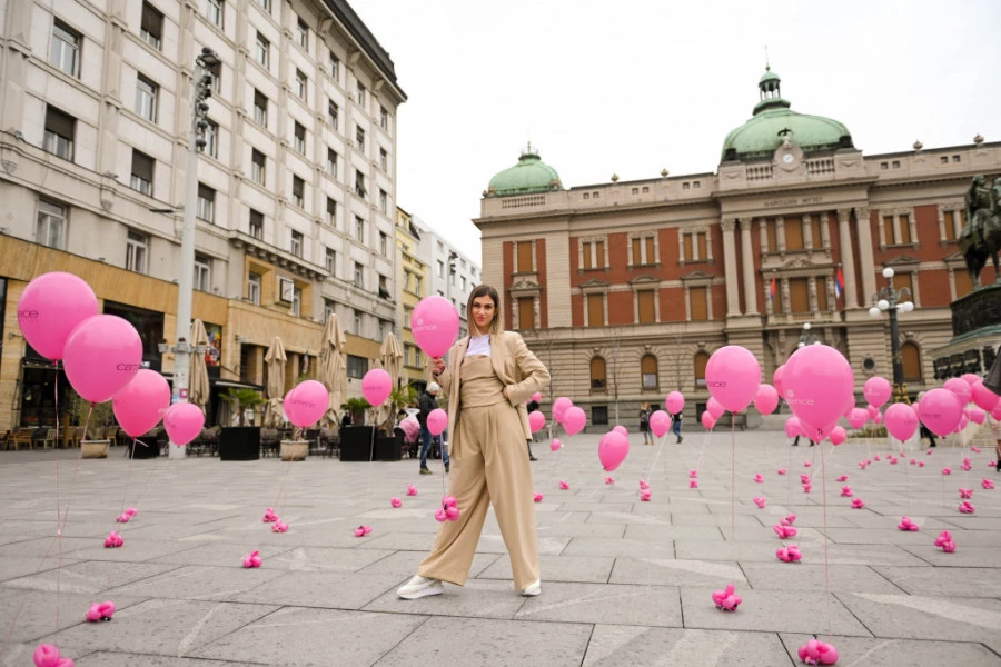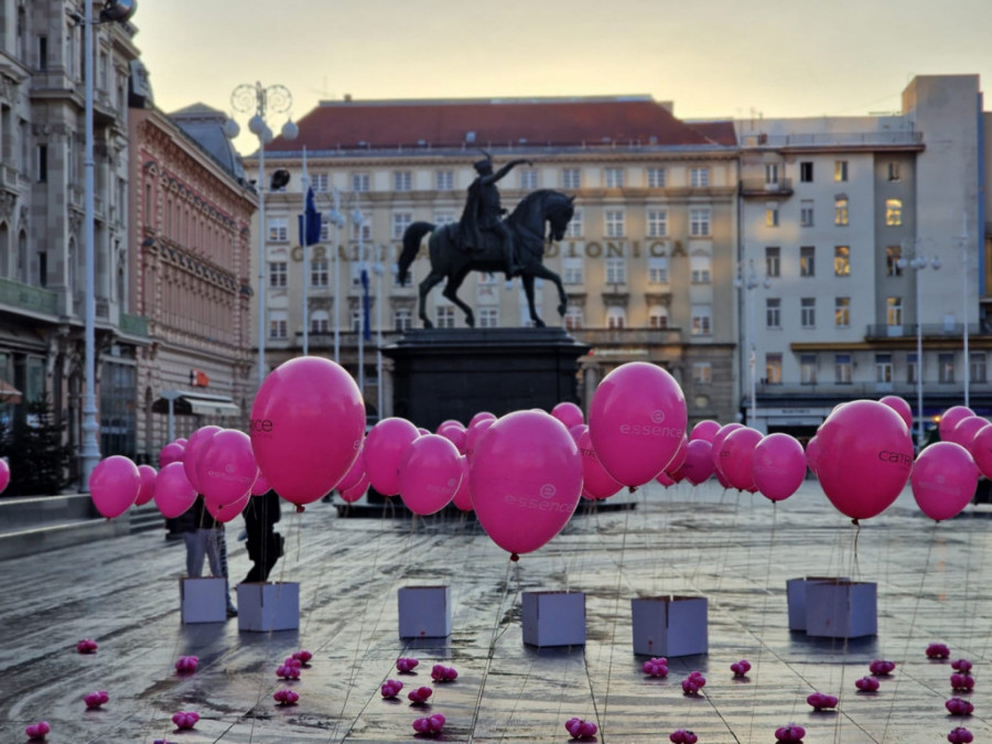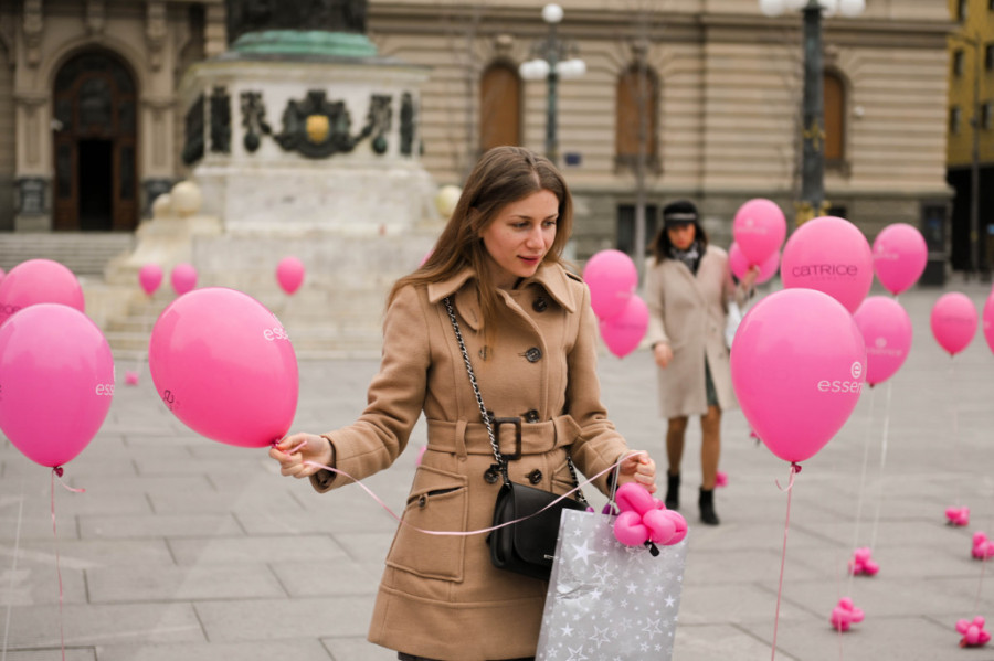 Trg Republike u centru Beograda, jutros je osvanuo u magičnim roze balonima koji su pojedinačno na trakama imali zavezane make up proizvode.