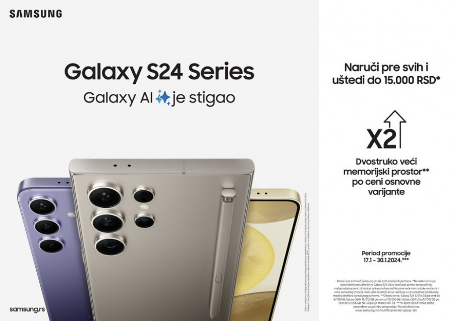 Pametni telefoni iz Galaxy S24 serije dostupni su u posebnom periodu pretprodaje, gde uz kupovinu jednog od uređaja dobijate model sa dvostruko većim memorijskim prostorom po ceni osnovne varijante, čime se može ostvariti značajna ušteda i dodatni bonus**.