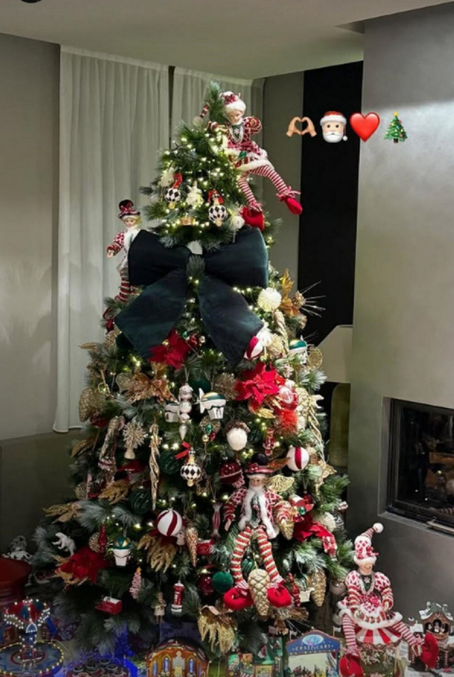 Posebnu pažnju privukao je vrh jelke, na kojem se umesto tradicionalne zvezde nalazi velika crna mašna od pliša, što je trenutno jedan od najmodernijih trendova u novogodišnjoj dekoraciji.