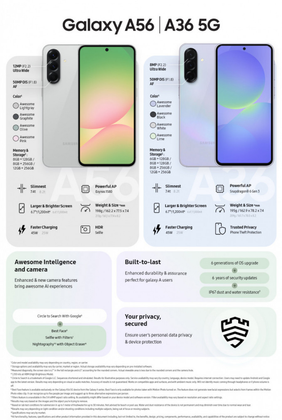 Sa spojem inovativnih funkcija, izuzetnog dizajna i pristupačne cene, Galaxy A36 i Galaxy A56 predstavljaju idealan izbor za sve koji traže savršen balans između performansi, dugotrajnosti i sigurnosti.