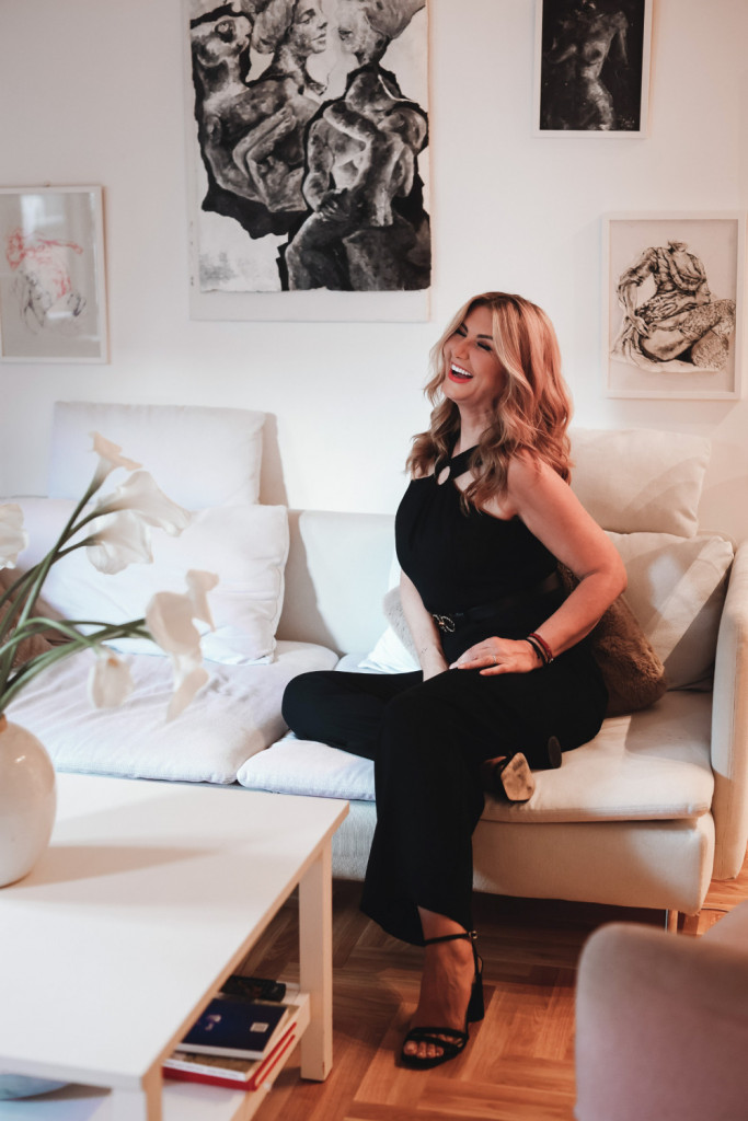 Dnevni boravak, ispunjen svetlim tonovima i knjigama, odražava duh umetnice. Na zidovima su pažljivo birane slike, a veliki trosed poziva na druženje i razgovor.