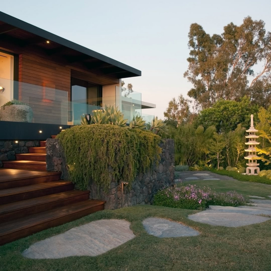 Često koristi prirodne elemente poput drveta, kamena i vode (ribnjaci s koi ribama).