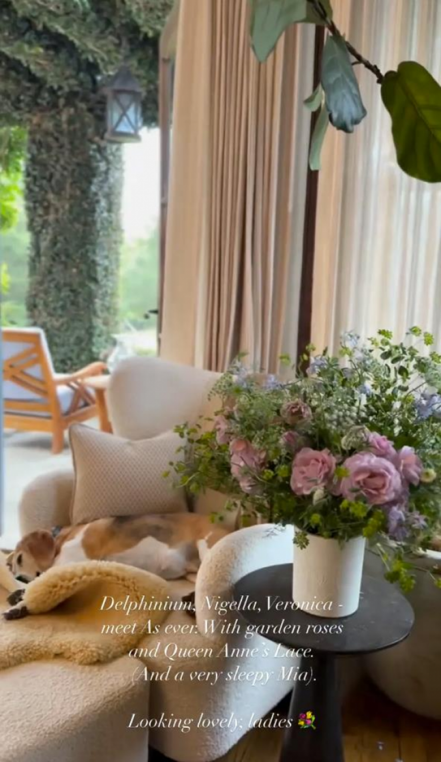 Na njemu smo mogli da vidimo njenog spašenog biga Miu, koja je mirno dremala u fotelji prekrivenoj Hermes ćebetom, pored vaze sa svežim cvećem.