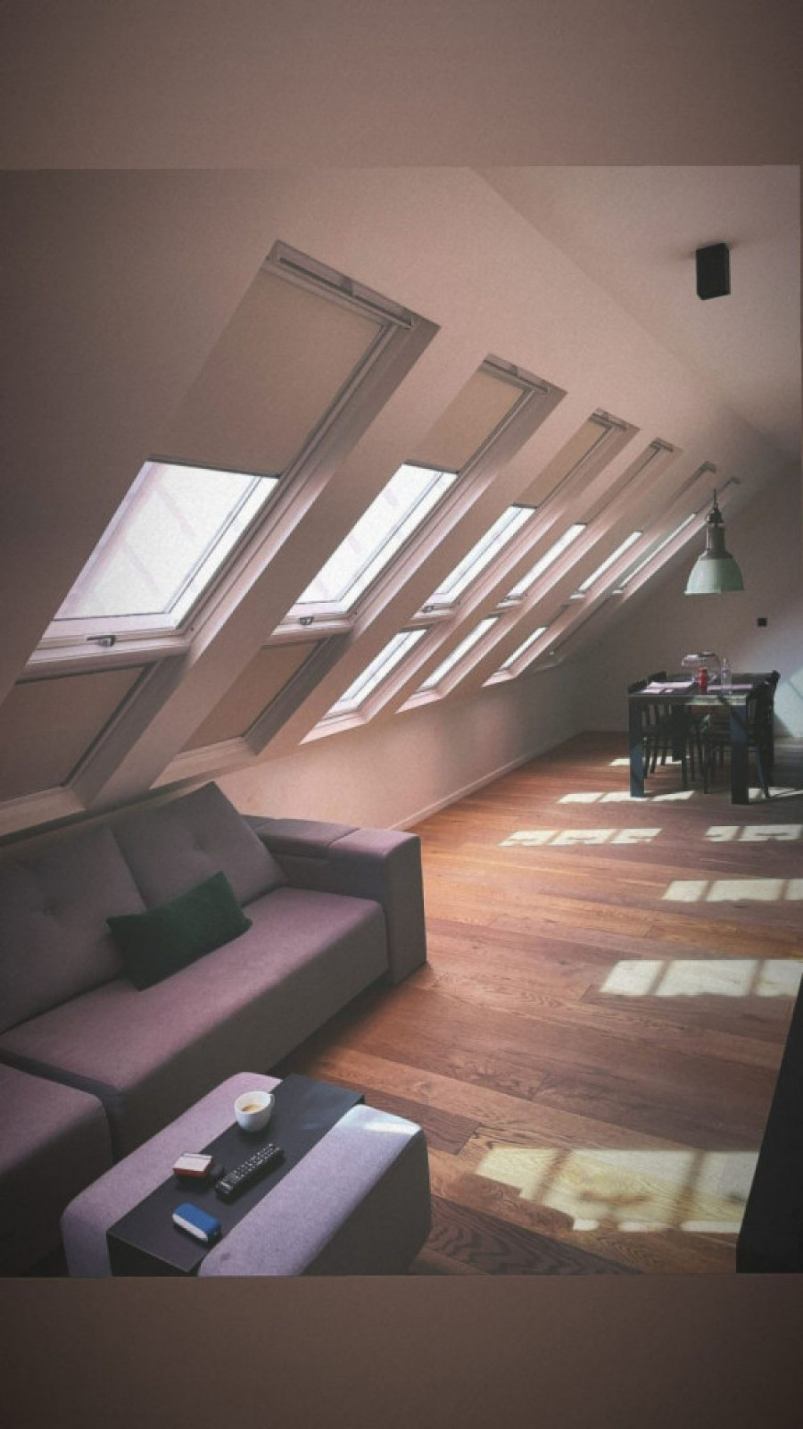 Suncem okupanoj dnevnoj sobi posebnu atmosferu daju kosi prozori koji imaju savršen pogled na nebo, te nesumnjivo zaljubljeni par u svom ljubavnom gnezdu na potkrovlju i čarobnom ambijentu posebno uživa noću.