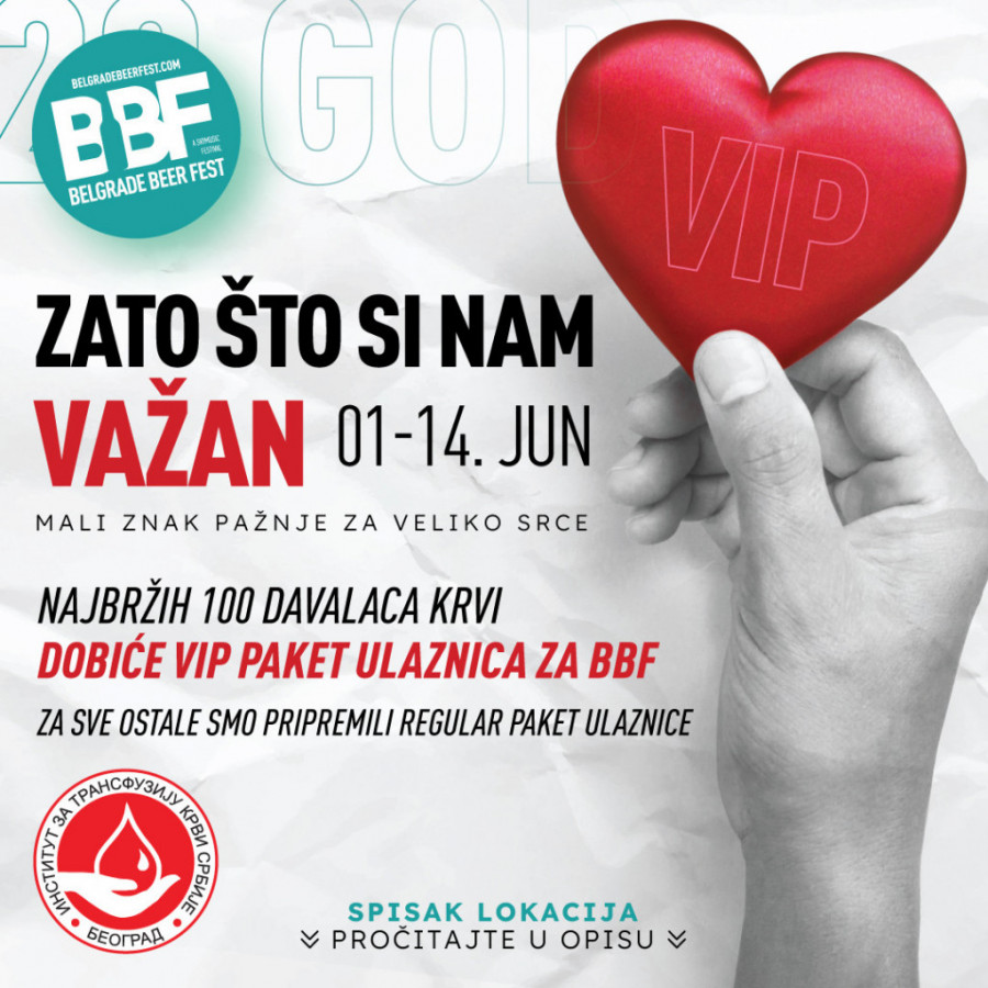 Akcija, pod imenom „Zato što si nam važan“ ima za cilj da nagradi humanost i da se na simboličan način oduži pojedincima koji pružaju podršku zajednici, te će prvih 100 dobrovoljnih davalaca krvi na poklon dobiti 100 VIP paketa ulaznica, dok će narednih 1000 biti darivano regular paketima ulaznica za sve dane Belgrade Beer Fest-a.