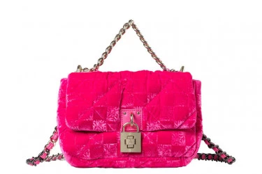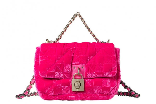 Tašna u nijansi fuksije napravljena je od finog somota, a možete je nositi u ruci ili preko ramena – umesto kaiša ima lanac u boji zlata, detalj koji je ove sezone takođe in.