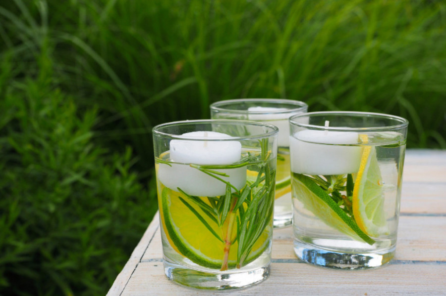Potrebno vam je: 2 velike tegle, 10 kapi ulja od eukaliptusa, 10 kapi ulja od limunova trave (po želji), 1 limun isečen na kriške, 1 limeta isečena na kriške, 3-4 stabljike svežeg ruzmarina i svećice.