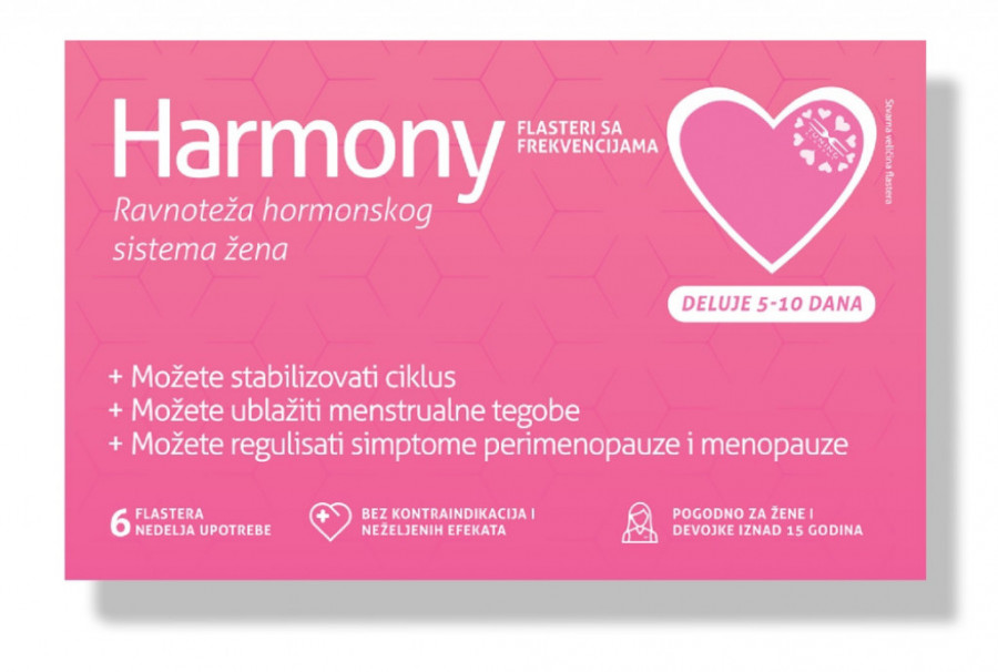 - Ono što se u ovom periodu dešava je da jajnici prestaju da funkcionišu, što je izuzetno stresno za organizam žene. Period perimenopauze i menopauze označava kraj plodnosti, prestaje lučenje estrogena, što izaziva brojne neprijatnosti i izaziva hormonalnu neravnotežu. Moja preporuka bi bili "Harmony" flasteri sa frekvencijama, koji se lako nanose i vodootporni su, tako da vas neće sprečavati u svakodnevnim aktivnostima. Oni sadrže kombinaciju frekvencija koje uspostavljaju ravnotežu hormonskog sistema žena i kada ih jednom otkriju, postaju tajni saveznik i mlađih devojaka i žena koje imaju probleme sa ciklusom, PMS-om, začećem, endometriozom, policističnim jajnicima, ali i svih žena koje se spremaju za proces vantelesne oplodnje.