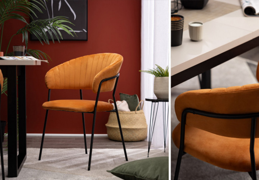 Trpezarijska stolica K426 je atraktivan komad nameštaja, a zahvaljujući svom dizajnu i boji može se istaći kao akcentni detalj i time doprineti kompletnom utisku ambijenta, njegovoj prozračnosti i privlačnosti. Pored udobnosti sedišta i naslona koji se nastavlja u vidu rukonaslona, ovu stolicu čini i crna metalna konstrukcija koja, zajedno sa punim štofom, predstavlja idealni balans struktura.