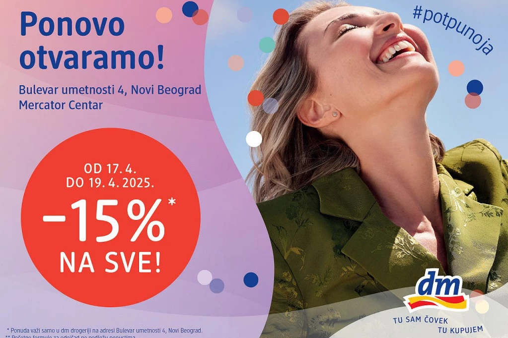 Ponovno otvaranje dm drogerije na adresi Bulevar umetnosti 4, zakazano je za 17. april 2025. U osveženom, modernom ambijentu, kupci mogu pronaći širok asortiman dm proizvoda za lepotu, negu, zdravlje, mame i bebe, domaćinstvo i još mnogo toga. Ovim povodom, dm je kupcima obezbedio 15% popusta na sve, i to u periodu od 17. do 19. 4. 2025. godine.